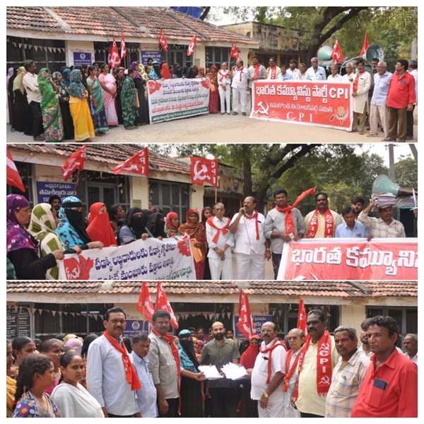 న్యూస్ తెలుగు/ : రాష్ట్ర ప్రభుత్వం అధికారంలోకి వచ్చే ముందు ఎన్నికలప్పుడు ప్రజలకు ఇచ్చిన హామీలు అమలు చేయాలని సిపిఐ పల్నాడు జిల్లా కార్యదర్శి మారుతి వరప్రసాద్ రాష్ట్ర ప్రభుత్వాన్ని డిమాండ్ చేశారు. సిపిఐ రాష్ట్ర సమితి పిలుపుమేరకు శుక్రవారం నాడు రాష్ట్రంలోని అన్ని రెవెన్యూ కార్యాలయాల వద్ద సిపిఐ ఆధ్వర్యంలో భారీ ఎత్తున ధర్నా కార్యక్రమాలు నిర్వహించారు. అందులో భాగంగా వినుకొండ పట్టణంలోని తాహసిల్దార్ కార్యాలయం వద్ద ఇళ్ల స్థలాలు లేని నిరుపేదలు వారి వారి ఇంటి స్థలాల కొరకు అర్జీలు తీసుకొని వచ్చి స్థానిక తహసిల్దార్ కి సిపిఐ ఆధ్వర్యంలో ఇవ్వడం జరిగింది. అనంతరం సిపిఐ నేతలు మాట్లాడుతూ. రాష్ట్ర ముఖ్యమంత్రి చంద్రబాబు ఇల్లు లేని నిరుపేదలకు ఇళ్ల స్థలాలు వెంటనే పంపిణీ చేయాలని ఇంటి నిర్మాణమునకు ఐదు లక్షల రూపాయలు ఇవ్వాలని రాష్ట్రంలో ఇల్లు లేని ఇళ్ల స్థలాలు లేని పేద ప్రజలకు పట్టణాలలో రెండు సెంట్లు గ్రామాలలో మూడు సెంట్లు ఇస్తానని ఇంటి నిర్మాణమునకు నాలుగు లక్షల రూపాయలు ఇస్తానని ముఖ్యమంత్రి వాగ్దానం చేసి ఉన్నారు. కానీ ఇంటి నిర్మాణమునకు ప్రభుత్వం ప్రకటించిన నాలుగు లక్షల రూపాయలు చాలవు ఐదు లక్షలు ఇవ్వాలని సిపిఐ డిమాండ్ చేస్తున్నదన్నారు. అంతేకాక రాష్ట్ర ముఖ్యమంత్రి ప్రకటించిన సూపర్ సిక్స్ పథకాలను ఒకదాని వెంట ఒకటి వెంటనే అమలు చేయాలని ముందుగా తల్లికి వందనం రైతుకు 20,000 మహిళలకు నెలకు 1500 వెంటనే అమలు చేయాలని ఆయన కోరారు. రాష్ట్ర ప్రభుత్వం స్మార్ట్ మీటర్లను ఎత్తివేయాలని ప్రజలందరూ స్మార్ట్ మీటర్ల పట్ల అప్రమత్తంగా ఉండాలని అదాని కంపెనీలతో గత జగన్మోహన్ రెడ్డి ప్రభుత్వం చేసుకున్న స్మార్ట్ మీటర్ ఒప్పందాలను తెలుగుదేశం నాయకులు కూడా వ్యతిరేకించారని కానీ ఈనాడు స్మార్ట్ మీటర్లను అమలు చేయాలని చూస్తున్నారని ప్రశ్నించిన వారికి మౌనముద్ర సమాధానంగా ఉన్నదని ప్రధానంగా జగన్మోహన్ రెడ్డి అదానీ ల ఒప్పందాలను కాదనలేక, నరేంద్ర మోడీ శిష్యుడిగా ఉన్న అదాని బంధాన్ని వ్యతిరేకించలేక ప్రజల పైన స్మార్ట్ మీటర్ల భారాలను మోపడం అన్యాయమని దీనిని ప్రజలు వ్యతిరేకించాలని అన్నారు. ఇటీవల పెరిగిన వంట నూనెలు పప్పులు సరుకుల రేట్లు ఆకాశాన్ని అంటుతున్నాయని అధిక ధరలను వెంటనే తగ్గించాలని ఆయన డిమాండ్ చేశారు. తిరుపతిలో టోకెన్ల కొరకు జరిగిన తోకేసలాటలో మరణించిన కుటుంబాలకు సంతాపాన్ని తెలుపుతూ వారికి వెంటనే ప్రభుత్వం ఎక్స్రేషియా ఇవ్వాలని హాస్పటల్లో ఉన్న వారికి మెరుగైన వైద్య చికిత్సలు చేయాలని మరొకసారి ఇటువంటి పరిస్థితులు రాకుండా టీటీడీ యాజమాన్యం తగు చర్యలు తీసుకోవాలని ఆయన డిమాండ్ చేశారు. కార్యక్రమంలో పట్టణ కార్యదర్శి ఉలవలపూడి రాము అధ్యక్షత వహించారు. ఈ క