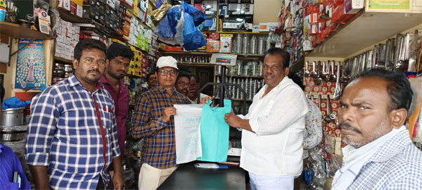 న్యూస్ తెలుగు / వినుకొండ : మున్సిపల్ కమిషనర్ సుభాష్ చంద్రబోస్ ఆదేశాల మేరకు శానిటరీ ఇన్స్పెక్టర్ షేక్ ఇస్మాయిల్ ఆధ్వర్యంలో మంగళవారం పట్టణంలో ఉన్న అన్ని హోల్ సేల్ వ్యాపారస్తులకు ప్లాస్టిక్ నిషేధ సర్కులర్స్ ఇవ్వడం జరిగినది. ఇందులో భాగంగా (120 మైక్రాన్స్ కంటే తక్కువ) ప్లాస్టిక్ క్యారీ బ్యాగులు, ధర్మకోల్స్ ప్లాస్టిక్ ప్లేట్స్, గ్లాసులు, ప్లాస్టిక్ జెండాలు మొదలైనవి అమ్ముటకు ప్రభుత్వం నిషేదించడమైనది. మంగళవారం పట్టణంలోని అన్ని ప్లాస్టిక్ హోల్ సెల్ మరియు రిటైల్ షాపుల నందు రైడ్ నిర్వహించి ఈ విషయంపై అవగాహన కల్పించడం జరిగినది. మరియు నిషేధించబడిన సింగిల్ యూసేజ్ ప్లాస్టిక్ ఇతర నిషేధిత ప్లాస్టిక్ వస్తువులు అమ్మిన లేదా వినియోగించిన, అటువంటి వారిపై 5,000 రూపాయలు జరిమానా మరియు చట్ట పరమైన చర్యలు తీసుకుంటామని తెలిపారు. ఈ కార్యక్రమంలో శానిటరీ సెక్రటరీలు మరియు మేస్త్రీలు తదితరులు పాల్గొన్నారు. (Story : స్వచ్ఛ ఆంధ్ర స్వర్ణాంధ్ర లో భాగంగా సింగిల్ యూస్డ్ ప్లాస్టిక్ నిషేధం)