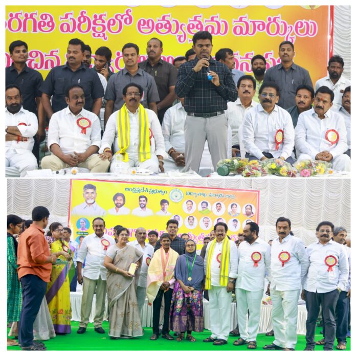 న్యూస్ తెలుగు /వినుకొండ : విద్యార్థులకు మంచి మార్కులతో పాటు విలువలతో కూడిన విద్యాను అందించేలా ప్రమాణాలు పెంచేందుకు ముఖ్యమంత్రి చంద్రబాబు, మంత్రి లోకేష్ కృషి చేస్తున్నారని ప్రభుత్వ చీఫ్ విప్, వినుకొండ ఎమ్మెల్యే జీవీ ఆంజనేయులు అన్నారు. విద్యా సంస్కరణల్లో భాగంగా మంత్రి లోకేష్ తల పెట్టిన మోడల్ స్కూల్స్ ద్వారా రానున్న రోజుల్లో దేశానికే ఆదర్శంగా ఏపీ మారబోతుందన్నారు. మంగళవారం నరసరావుపేట పట్టణం భువనచంద్ర టౌన్ హాల్లో జిల్లాస్థాయి పదవ తరగతి ఫలితాల్లో ఉత్తీర్ణత సాధించిన విద్యార్థుల అభినందన సభలో చీఫ్ విప్ జీవీ పాల్గొన్నారు. ఈ సందర్భంగా మాట్లాడిన ఆయన 580కి పైగా మార్కులతో ఉత్తమఫలితాలు సాధించిన విద్యార్థులు అందర్నీ అభినందించారు. రాష్ట్ర సగటు కంటే మంచిఫలితాలు సాధించినందుకు పల్నాడు జిల్లా విద్యార్థులు, టీచర్లను అభినందించారు. స్టేట్-1 ర్యాంకు పల్నాడు జిల్లా మాచర్ల ప్రాంతానికి రావడం ఎంతో సంతోషం కలిగించిందన్నారు. 598మార్కులు సాధించిన చంద్రికకు అభినందనలు. 596 మార్కులు సాధించిన సమీర, 593మార్కులు సాధించిన అమూల్యలకు ప్రత్యేక ప్రశంసలు తెలియజేశారు. రాష్ట్రవ్యాప్తంగా కూడా ఈసారి మంచిఫలితాలు వచ్చాయన్న జీవీ లోకేష్ విద్యాశాఖ బాధ్యతలు తీసుకున్న తర్వాత పాఠశాల విద్య రూపురేఖలే మార్చుతున్నారని తెలిపారు. టీచర్ల నైపుణ్యా లు పెంపొందించేందుకు శిక్షణ ఏర్పాటు చేయనున్నారని తెలిపారు. విద్యార్థుల్లో వ్యక్తిత్వ వికాసం, నాయకత్వ లక్షణాల కోసం కార్యక్రమాలు నిర్వహించ బోతున్నారని అన్నారు. విద్యార్థి దశలోనే మంచి పౌరులుగా తీర్చిదిద్దాలని కూటమి ప్రభుత్వం ముందుకు వెళ్తోంది. ఈ కార్యక్రమంలో జిల్లా కలెక్టర్ అరుణ్ బాబు, శాసనసభ్యులు అరవిందబాబు, జూలకంటి బ్రహ్మారెడ్డి, ఎమ్మెల్సీ ఆలపాటి రాజేంద్రప్రసాద్, మాజీ శాసనసభ్యులు మక్కెన మల్లికార్జున రావు విద్యాశాఖ అధికారులు, ఉపాధ్యాయులు తదితరులు పాల్గొన్నారు.(Story:మార్కులతో పాటు విలువలతో కూడిన విద్య అందించడమే లక్ష్యం)