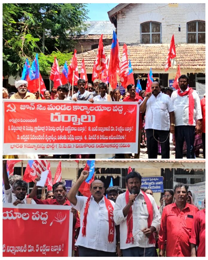న్యూస్ తెలుగు/వినుకొండ : కేంద్రంలో అధికారంలో ఉన్న ప్రభుత్వం రాజ్యాంగ విలువలకు పాతర వేస్తోందని ప్రజాస్వామ్యాన్ని అపహాస్యం పాలు చేస్తుందని సిపిఐ పల్నాడు జిల్లా కార్యదర్శి మారుతి వరప్రసాద్ అన్నారు. సోమవారం నాడు వినుకొండ పట్టణంలోని తహసిల్దార్ కార్యాలయం వద్ద వినుకొండ రూరల్ మండల కమిటీ ఆధ్వర్యంలో జరిగిన ధర్నా కార్యక్రమంలో పాల్గొని ఆయన మాట్లాడుతూ. కేంద్రంలోనూ రాష్ట్రంలోనూ కూటమి ప్రభుత్వాలు అధికారంలో ఉన్నాయని ప్రజలకు ఇచ్చిన వాగ్దానాలు అమలు చేయడంలో అవి పూర్తిగా విఫలం చెందుతున్నాయని ఆయన అన్నారు. ఈ ప్రభుత్వాలు అధికారంలో కి వచ్చి సంవత్సరకాలం అవుతున్నప్పటికిని ప్రజలకు ఇచ్చిన వాగ్దానాలు ఇంకా నెరవేర్చలేదని ఆయన విమర్శించారు. ముఖ్యంగా భారతీయ జనతా పార్టీ మన రాష్ట్ర ప్రజలకు అనేక హామీలు ఇచ్చిందని వాటిలో ఒకటి కూడా నెరవేర్చలేదని ఇటీవల ఆంధ్రప్రదేశ్ కు వచ్చిన ప్రధానమంత్రి రాష్ట్ర ప్రభుత్వానికి ఆర్థికంగా ఆదుకుంటారని రాష్ట్ర ప్రజల ఆశించారని కానీ రాష్ట్ర ప్రజలకు మొండి చేయి చూపించారని, రాష్ట్ర ప్రభుత్వం అప్పులు చేసి నిర్మించాలనుకుంటున్న వివిధ ప్రాజెక్టులకు వివిధ కార్యక్రమాలకు శంకుస్థాపనలు చేశారు. కానీ కేంద్రం నుండి తాము రాష్ట్రానికి ఇస్తున్నటువంటి నిధులు ఏమాత్రం ప్రకటించలేదని ఆయన తీవ్రంగా విమర్శించారు. 2014 నుండి అధికారంలోకి వచ్చిన నరేంద్ర మోడీ ప్రభుత్వం రాష్ట్రానికి సవతి తల్లి ప్రేమ చూపిస్తుందని అన్నారు. రాష్ట్రానికి ప్రత్యేక హోదా ఇవ్వకపోగా రాష్ట్రంలో ఉన్న ఏకైక భారీ పరిశ్రమ విశాఖ ఉక్కును ప్రైవేటుపరం చేయాలని చూడటం చాలా దుర్మార్గమన్నారు. రాష్ట్రంలో అధికారంలో ఉన్న కూటమి ప్రభుత్వం రాష్ట్ర ప్రజలకు ఇచ్చిన వాగ్దానాలు నెరవేర్చాలని గత ప్రభుత్వం ఇచ్చిన సెంటు స్థలము కంటే రెండు సెంట్లు ఇస్తామని, గ్రామాలలో మూడు సెంట్లు ఇస్తామని, ఇంటి నిర్మాణానికి వైసిపి ప్రభుత్వం ఇచ్చిన 1,80,000 కంటే, ఎక్కువగా నాలుగు లక్షల ఇస్తామని ప్రజలకు హామీలు ఇచ్చారని ఇంకా రైతాంగానికి 20000 తల్లికి వందనం 15000 ఉచిత బస్సు ప్రయాణం, మహిళలకు నెలకు 1500 రూపాయలు, తదితర సూపర్ సిక్స్ పథకాలను వెంటనే అమలు చేయాలని పేద ప్రజలు నిరుపేదల ఆశిస్తున్నటువంటి ఇంటి స్థలాలు గ్రామాలలో మూడు సెంట్లు, పట్టణాలలో రెండు సెంట్లు ఇచ్చి ఇంటి నిర్మాణానికి ఐదు లక్షల రూపాయలు ఇవ్వాలని వృద్ధాప్య వితంతు వికలాంగులు ఒంటరి మహిళల పెన్షన్లు అర్హులైన వారికి వెంటనే విడుదల చేయాలని రేషన్ కార్డులు లేని నిరుపేద కుటుంబాలకు వెంటనే రేషన్ కార్డులు ఇవ్వాలని ఆయన రాష్ట్ర ప్రభుత్వాన్ని డిమాండ్ చేశారు. ఈ కార్యక్రమంలో నియోజకవర్గ కార్యదర్శి బూదాల శ్రీనివాసరావు పాల్గొని మాట్లాడుతూ. కమ్యూనిస్టు పార