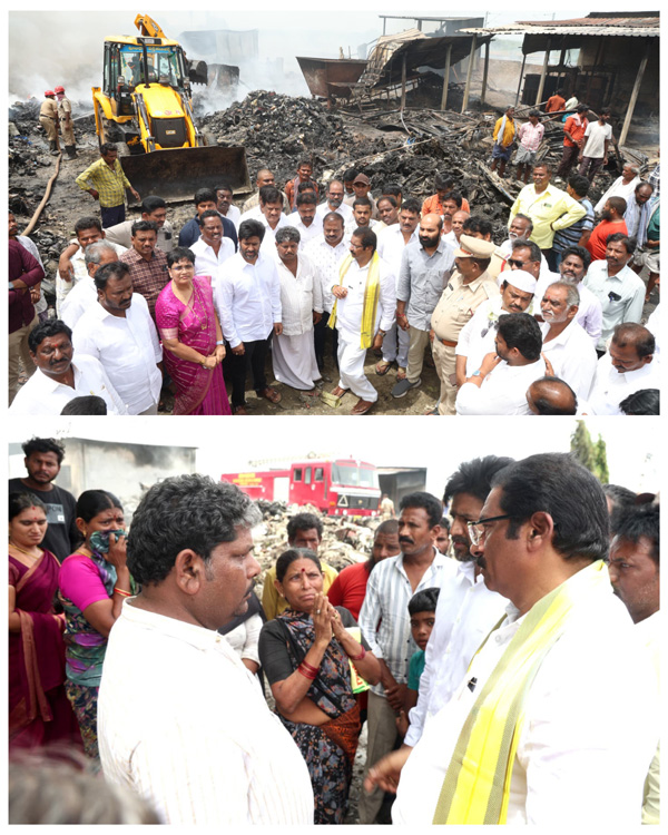 న్యూస్ తెలుగు / వినుకొండ : అగ్ని ప్రమాదంలో నష్టపోయిన బాదిత కుటుంబాన్ని ప్రభుత్వం ఆదుకుంటుందని ప్రభుత్వ చీఫ్ విప్, సీనియర్ శాసనసభ్యులు జీవి ఆంజనేయులు అన్నారు. వినుకొండ పట్టణంలోని మార్కాపురం రోడ్డులో గల రంగస్వామి ప్లాస్టిక్ వర్క్ వెంకటేశ్వర ట్రేడర్స్ (ప్లాస్టిక్ వ్యర్ధాల గోదాము)లో శుక్రవారం తెల్లవారుజామున అగ్నిప్రమాదం జరిగింది. సమాచారం తెలుసుకున్న చీఫ్ విప్ జీవి ఆంజనేయులు అధికారులతో కలిసి సంఘటన ప్రాంతాన్ని సందర్శించారు. అగ్ని ప్రమాద బాధిత కుటుంబ సభ్యులు తమని ఆదుకోవాలంటూ విలపిస్తూ చీఫ్ విప్ జీవి వద్ద మొరపెట్టుకున్నారు. ప్లాస్టిక్ చెత్త సేకరించే కంపెనీలో అగ్నిప్రమాదం జరగటం బాధాకరమని, ఇండస్ట్రీ యజమాని నెమలయ్య కుటుంబానికి అండగా ఉంటామని తెలిపారు. షార్ట్ సర్క్యూట్ వలన ప్లాస్టిక్ వర్క్ స్టేటస్ లో శుక్రవారం తెల్లవారుజామున అగ్ని ప్రమాదం జరిగి ప్లాస్టిక్ భారీగా ఖాళీ బూడిద తీవ్ర నష్టం వాటిల్లిందన్నారు. అగ్ని ప్రమాదం సంఘటన వివరాలను ప్రభుత్వం దృష్టికి తీసుకువెళ్లి యజమానికి అండగా నిలిచి ఆదుకోవడం జరుగుతుందన్నారు. భవిష్యత్తులో ఇలాంటి సంఘటనలు జరగకుండా అధికారులు తగిన జాగ్రత్తలు తీసుకోవాలని ఆదేశించారు. ప్లాస్టిక్ వ్యర్ధాల గోదాములు, కొన్ని పరిశ్రమలకు సంబంధించిన స్టాక్ పాయింట్ల వద్ద అగ్ని ప్రమాదాలు జరగకుండా ముందస్తు జాగ్రత్తలు తీసుకోవాలని సూచించారు. ప్లాస్టిక్ వ్యర్ధాల కంపెనీలో అగ్నిప్రమాదం సమాచారం తెలుసుకున్న అగ్నిమాపక దళం హుటాహుటిన సంఘటన ప్రాంతానికి చేరుకొని నరసరావుపేట, కురిచేడు నుంచి అగ్నిమాపక వాహనాలను పిలిపించి మంటలను అదుపు చేసిన ఫైర్ అధికారులను సిబ్బందిని ప్రభుత్వ చీఫ్ విప్ జీవి ఆంజనేయులు అభినందించారు. సమాచారం తెలుసుకున్న వెంటనే మున్సిపల్ కమిషనర్ సిబ్బందితో అక్కడ చేరుకొని నీటి ట్యాంకర్లను తెప్పించి మంటలను అదుపు చేసే ప్రయత్నం చేసిన కమిషనర్ సుభాష్ చంద్రబోస్ ను ఆయన అభినందించారు. ఇలాంటి సంఘటనలు పునరావృతం కాకుండా అధికారులు జాగ్రత్తలు తీసుకోవాలని కోరారు. చీఫ్ విప్ జీవి తో పాటు దర్శి నియోజకవర్గ టిడిపి నాయకులు కడియాల లలిత్ సాగర్, జనసేన నాయకులు నాగ శ్రీను రాయల్, నిశంకర్రావు శ్రీనివాసరావు, నాయకులు, తదితరులు పాల్గొన్నారు. (Story:అగ్ని ప్రమాద బాదిత కుటుంబాన్ని ఆదుకుంటాం..)