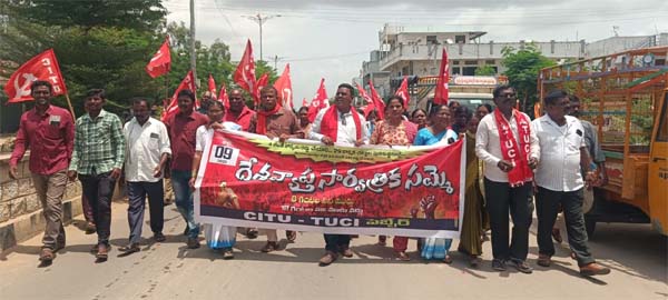 న్యూస్తెలుగు/వనపర్తి : పెబ్బేరు మండల కేంద్రంలో సుభాష్ చౌరస్తా నుంచి మార్కెట్ యార్డ్ వరకు ప్రదర్శనగా వెళ్లి అక్కడ సభ నిర్వహించడం జరిగింది ఈ సందర్భంగా సిఐటియు వనపర్తి జిల్లా అధ్యక్షులు మండ్ల రాజు మాట్లాడుతూ కేంద్ర బిజెపి ప్రభుత్వం కార్మిక వ్యతిరేక విధానాలను ప్రజా వ్యతిరేక విధానాలను నిరసిస్తూ జులై 9న దేశవ్యాప్త సార్వత్రిక సమ్మెకు ట్రేడ్ యూనియన్స్ పిలుపునిచ్చాయి. ఈ సమ్మెను పెబ్బేరు మండల కేంద్రంలో ఘనంగా నిర్వహించారు. కేంద్ర బిజెపి ప్రభుత్వం కార్మికుల ను బానిసత్వంలోకి నెట్టే విధంగా నాలుగు లేబర్ కోడ్ లను తీసుకొచ్చి కార్మికుల మెడకు ఉరితాలుగా బిగించారన్నారు. పెట్టుబడుదారులకు అనుకూలంగా ఉన్న నాలుగు లేబర్ కోడ్ లను తక్షణమే రద్దు చేయాలని డిమాండ్ చేశారు. కార్మికులకు రోజుకు 12 గంటల పని దినాన్ని అమలు చేసే విధానాన్ని ఉపసంహరించుకోవాలని డిమాండ్ చేశారు. కార్మికులకు కనీస వేతనం 26 వేల రూపాయలు ఇవ్వాలని అర్హులైన కార్మికులందరికీ పిఎఫ్ ఈఎస్ఐ సౌకర్యం కల్పించి. కాంట్రాక్ట్ ఔట్సోర్సింగ్ ఉద్యోగులందరినీ పర్మినెంట్ చేయాలన్నారు. ధరలను అదుపు చేయడంలో మోడీ ప్రభుత్వం విఫలమైందని ప్రభుత్వ రంగ సంస్థలను అప్పనంగా ప్రైవేట్ సంస్థలకు అప్పజెప్పే విధంగా నేషనల్ మానిటర్ పైపులైజేషన్ NMP పేరుతో ప్రభుత్వ రంగ సంస్థలను ప్రైవేటీకరణ చేయడం దుర్మార్గమైన చర్య అన్నారు. యువతకు ఉపాధి చూపడంలో మోడీ ప్రభుత్వం విఫలం అవడంతో పాటు ఉన్న ఉద్యోగాలకు కూడా మోడీ ప్రభుత్వం ఊడగొడుతుందని ఎద్దేవా చేశారు. రైతాంగం పండించిన పంటలకు గిట్టుబాటు ధర కల్పించడం లేదన్నారు. ఉపాధి హామీ పథకాన్ని పట్టణ ప్రాంతాలకు విస్తరింప చేసి. సంవత్సరానికి 200 రోజులు పనులు కల్పించి రోజుకి 600 కూలీ ఇవ్వాలని డిమాండ్ చేశారు. కార్మికుల హక్కుల కోసం రైతాంగ హక్కుల కోసం ఉపాధి హామీ కూలీల డిమాండ్ల సాధన కోసం యువతకు ఉపాధి ఉద్యోగాల సదనకై సాగుతున్న దేశవ్యాప్త సార్వత్రిక సమ్మెలో కార్మికులు కార్మికులు పెద్ద ఎత్తున పాల్గొన్నారు ఈ టి యు సి ఐ జిల్లా నాయకులు శీను ఆవాజ్ జిల్లా కార్యదర్శి ఎండి పెద్దకాజా సిఐటియు నాయకులు ఊసన్న అనీఫ్ అంగన్వాడి యూనియన్ జిల్లా కోశాధికారి రాధా నాయకులు రాజేశ్వరి రాములు మన్నెం చెన్నమ్మ ఈశ్వరమ్మ నరసమ్మ నారాయణ రాములు తదితరులు పాల్గొన్నారు. (Story:ప్రైవేటీకరణ చేయడం దుర్మార్గమైన చర్య)
