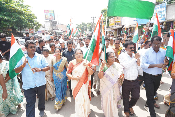 న్యూస్ తెలుగు /సాలూరు : ప్రతి ఇంటిపై జాతీయ జెండాని ఎగరవేయడం వలన స్వాతంత్ర్య సమరయోధుల త్యాగాలను స్మరించుకోవాలని ఆంధ్రప్రదేశ్ శ్రీ శిశు సంక్షేమ మరియు గిరిజన శాఖ మాత్యులు గుమ్మడి సంధ్యారాణి అన్నారు . బుధవారం సాలూరు పట్టణంలో ” హర్ ఘర్ తిరంగా” కార్యక్రమం ఉత్సాహంగా ప్రారంభించారు. ఈ ర్యాలీలో పాల్గొని, ప్రజలలో దేశభక్తి స్ఫూర్తిని మరింతగా పెంచాలని తెలిపారు. దేశం పట్ల ప్రతి ఒక్క పౌరుడు బాధ్యతగా మెలగాలని అన్నారు. మనలో ఐక్యత సోదరి భావం పెంపొందించుకోవాలని అన్నారు. ర్యాలీ సాలూరు ఎం ఆర్ ఓ కార్యాలయం వద్ద నుంచి ప్రారంభమై, ఎస్ బి ఐ బ్యాంకు వరకు శోభాయమానంగా సాగింది. ఈ కార్యక్రమంలో ప్రజలు, విద్యార్థులు, ప్రభుత్వ సిబ్బంది, ప్రజాప్రతినిధులు, సామాజిక సంస్థల ప్రతినిధులు మరియు పెద్ద సంఖ్యలో యువత ఈ కార్యక్రమంలో పాల్గొన్నారు. చేతుల్లో జాతీయ పతాకాలు పట్టుకొని, “వందే మాతరం”, “భారత్ మాతాకి జై” వంటి దేశభక్తి నినాదాలు చేస్తూ ర్యాలీ నిర్వహించారు. ఈ కార్యక్రమంలో ఎంపీడీవో పార్వతి, పట్టణ తెలుగుదేశం పార్టీ అధ్యక్షులు నిమాది తిరుపతిరావు, పప్పల మోహన్ రావు, డాక్టర్ శివకుమార్ , తదితరులు పాల్గొన్నారు. (Story:ప్రతి ఇంటిపై జాతీయ జెండాని ఎగరువేద్దాం)