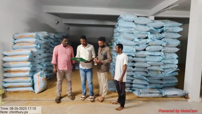 న్యూస్ తెలుగు/ చింతూరు : దేశ, రాష్ట్రవ్యాప్తంగా ఎరువుల కృత్రిమ కొరత సృష్టించటం, ఎక్కువ రేట్లకు అమ్మటం, నిరోధక చర్యలలో భాగంగా చింతూరులో మంగళవారం ఎస్సై రమేష్, హార్డ్డి కల్చర్ ఆఫీసర్ ముత్తయ్య, ఎర్రం పేట లోని మన గ్రోమోర్ ఫెర్టిలైజర్, షాపును మరో ప్రైవేట్ షాప్ ను తనిఖీ నిర్వహించారు. ఆయా షాపుల్లో డి ఎ పి, యూరియా నిల్వలు లేవని నిర్ధారించారు. ఈ మేరకు ప్రభుత్వ ఉన్నతాధికారులకు నివేదిక పంపుతున్నట్లు ఎస్సై తెలిపారు.(Story : ఎరువుల దుకాణాలను తనిఖీ చేసిన యస్ ఐ )