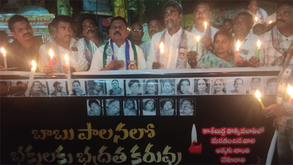 న్యూస్ తెలుగు /సాలూరు: కాశి బుగ్గ తొక్కి సలాట లో మరణించిన కుటుంబాలకు 25 లక్షల ఎక్స్గ్రేషియా ఇవ్వాలని, మరణించిన వారి ఆత్మకు శాంతి చేకూరాలని ఆంధ్రప్రదేశ్ మాజీ ఉప ముఖ్యమంత్రి వైయస్సార్ పార్టీ పొలిటికల్ అడ్వైజర్ కమిటీ సభ్యులు పీడిక రాజన్న దొర అన్నారు. సోమవారం సాలూరు పట్టణంలో బోసు బొమ్మ జంక్షన్ వద్ద కాశీబుగ్గలో మరణించిన వారి ఆత్మ శాంతి చేకూరాలని కొవ్వొత్తులతో శాంతియుత ర్యాలీ నిర్వహించారు. ఈ ర్యాలీ సాలూరు తాసిల్దార్ కార్యాలయం నుండి గొల్లవీధి జంక్షన్ వరకు నిర్వహించిన అనంతరం మౌనం పాటించారు.ఈ సందర్భంగా ఆయన మాట్లాడుతూ చంద్రబాబు నాయుడు 17 నెలల పాలనలో ప్రభుత్వంలో భక్తులకు భద్రత లేకుండా పోయిందని అన్నారు. కాశి బుగ్గ లో మరణించిన కుటుంబాలకు ఎక్స్గ్రేషియో 15 లక్షలు నుండి 25లక్షలు పెంచాలని డిమాండ్ చేశారు. సింహాచలంలో, తిరుపతిలో, కాశీబుగ్గలు మరణించిన భక్తులకు నష్టపరిహారము ఇచ్చారు కానీ ఈ మధ్యలో చాలామంది గిరిజన విద్యార్థులు మరణించిన వారికి నష్టపరిహారం ఇవ్వకపోవడం చాలా బాధాకరమని అన్నారు. మంత్రులు అధికారులు ప్రైవేట్ ఆలయంలో ఈ సంఘటన జరిగింది ప్రభుత్వానికి ఏటువంటి సంబంధం లేదని బాధ్యత రాహిత్యంగా. మాట్లాడం చాలా బాధాకరమని తెలిపారు. ఈ ప్రభుత్వం ప్రైవేటు దేవాలయాలకు ఎందుకు భద్రత ఇవ్వాలని అంటున్నది మరి వినాయక చవితి మండపాలకు దుర్గాదేవి మండపాలకి పరిమిషన్ తీసుకోవాలన్న ప్రభుత్వం, ప్రైవేట్ ఆలయాలకు ఎందుకు భద్రత కల్పించలేదని అన్నారు. ఈ కార్యక్రమంలో ఈ కార్యక్రమంలో వైయస్సార్ పార్టీ జిల్లా ప్రచార కార్యదర్శి గిరి రఘు, జిల్లా ప్రధాన కార్యదర్శి దండి శ్రీనివాసరావు, సాలూరు మండల వైస్ ఎంపీపీ రెడ్డి సురేష్ రెడ్డి, కొల్లి వెంకటరమణ, కాకి రంగా ప్రజలు కార్యకర్తలు పాల్గొన్నారు. (Story:కాశీబుగ్గ మృతుల కుటుంబాలకు 25 లక్షల ఎక్స్ గ్రేషియా)
