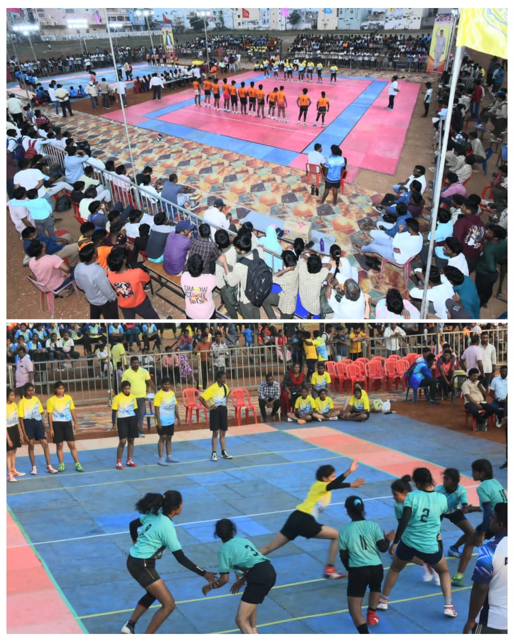 న్యూస్ తెలుగు/వినుకొండ : స్థానిక ప్రభుత్వ బాలుర ఉన్నత పాఠశాల నందు రెండవ రోజు ఉత్కంఠ భరితంగా కబడ్డీ పోటీలు జరిగింది. బాలికల విభాగంలో కడప వర్సెస్ శ్రీకాకుళం జట్ల మధ్య జరిగిన మ్యాచులు శ్రీకాకుళం బాలికల జట్టు విజయం సాధించింది. అదేవిధంగా బాలురు విభాగంలో అనంతపురం వర్సెస్ విజయనగరం మధ్య జరిగిన పోటీల్లో అనంతపురం బాలురు జట్టు విజయం సాధించారు. ఈ పోటీలను ఫ్లడ్లైట్ వెలుతురులో మరియు ప్రేక్షకులు చూసేందుకు వీలుగా గ్యాలరీని ఏర్పాటు చేశామని నిర్వాహకులు గంగినేని రాఘవరావు తెలిపారు. ఈ కార్యక్రమంలో స్కూల్ గేమ్స్ సెక్రెటరీ ఎన్ సురేష్ కుమార్ , డివిజనల్ సెక్రటరీ చిరంజీవి, రాధా కృష్ణ మూర్తి, చినరామయ్య జోన్ సెక్రటరీ వీరాంజనేయులు, ప్రెసిడెంట్ బాజు రాజేష్ మద్దం వెంకటేశ్వర్లు, వెంకట రత్నం, అంకారావు, వ్యాయామ ఉపాధ్యాయులు దగ్గరుండి పోటీలను నిర్వహిస్తున్నారు.(Story : రెండవ రోజు కొనసాగుతున్న కబడ్డీ ఆటల పోటీలు )