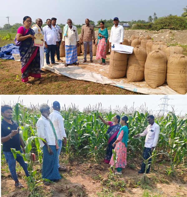 న్యూస్ తెలుగు / వినుకొండ : వినుకొండ నియోజకవర్గం లోని గోకనకొండ, నాగులవరం గ్రామాలలో బుధవారం పొలం పిలుస్తోంది కార్యక్రమం నిర్వహించారు. ఇందులో భాగంగా మండల వ్యవసాయఅధికారి జీ వరలక్ష్మి మాట్లాడుతూ. వరి పొలంలో అగ్గి తెగులు ఆశించినట్లు గమనించటం జరిగిందని, నివారణకు ట్రై సైక్లోజోల్ 120 గ్రాములు+బావిస్టిన్ 250 గ్రాములు ఎకరా పైరు పై పిచికారి చెయ్యడం ద్వారా అగ్గి తెగులు నివారించుకోవచ్చని అన్నారు. రైతులు ఖరీఫ్ లో ఈ పంట నమోదు చేయించుకొనీ , పండించిన వరి ధాన్యాన్ని రైతు సేవ కేంద్ర సిబ్బంది ద్వారా షెడ్యూలింగ్ చేయించుకొని, తేమశాతం 17% ఉన్నట్లయితే ధాన్యం కొనుగోలు కేంద్రం ద్వారా కనీస మద్దతు ధరకు అనగా గ్రేడ్ ఏ రకం క్వింటాలు రూ:2389/-, సాధారణ రకం క్వింటాలు రూ:2369,,75 కేజీలు గ్రేడ్ ఏ రకం రూ:1792 సాదారణ రకం 75 కేజీలు: 1777/-, నాణ్యత ప్రమాణం ఉన్నట్లయితే ధాన్యం కొనుగోలు కేంద్రం ద్వారా విక్రయించుకోవచ్చని అన్నారు. తేమ శాతం 17 కంటే అధికంగా ఉన్న ఎడల ఆరబెట్టుకోవాలని ఒకవేళ తేమ శాతం 17 కి మించి ఉన్నట్లయితే 1% కి 1 కిలో తరుగు తో 22% వరకు 5 కిలోల తరుగుతో ధాన్యం కొనుగోలు కేంద్రం ద్వారా ధాన్యం మద్దతు ధరకు అమ్ముకోవచ్చని తెలిపారు. (Story:గోకనకొండ లో పొలం పిలుస్తోంది..)