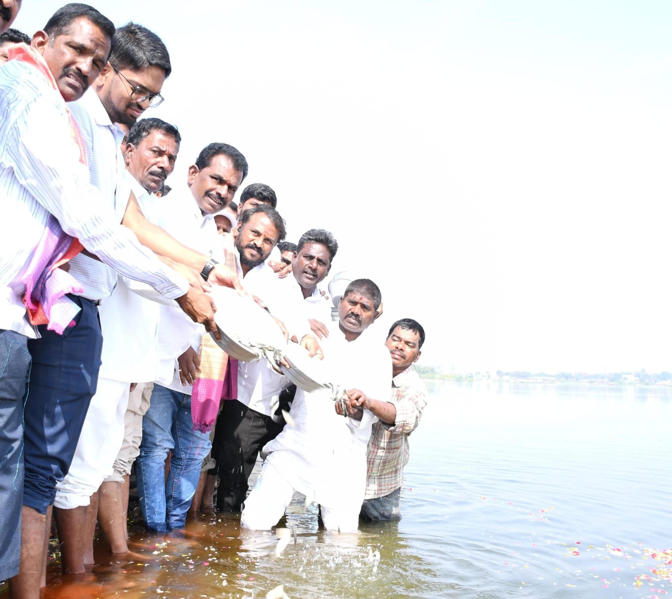 న్యూస్ తెలుగు/వనపర్తి : తెలంగాణ రాష్ట్రంలోని కాంగ్రెస్ సర్కార్ మత్స్యకారుల అభివృద్ధి కోసం పాటుపడి ఉందని, రానున్న రోజులన్ని మత్స్యకారులకు మంచి రోజులేనని, ముదిరాజ్ కార్పొరేషన్ ఏర్పాటు చేసి ముదిరాజుల, మత్స్య సహకార సంఘాల అభివృద్ధికి కృషి చేస్తున్న ఏకైక ప్రభుత్వం కాంగ్రెస్ ప్రభుత్వమేనని వనపర్తి శాసనసభ్యులు తూడి మేఘారెడ్డి అన్నారు. మంగళవారం ఆయన వనపర్తి పట్టణంలోని నల్లచెరువులో జిల్లా కలెక్టర్ ఆదర్శ్ సురభి గారితో కలిసి ఆయన చేప పిల్లలను విడుదల చేశాడు. ఈ సందర్భంగా ఎమ్మెల్యే మాట్లాడుతూ పెద్ద సామాజికవర్గమైన ముదిరాజ్ మరియు మత్స్యకారుల, అభివృద్ధికై కాంగ్రెస్ ప్రభుత్వం ప్రత్యేక దృష్టి సాధించిందన్నారు.