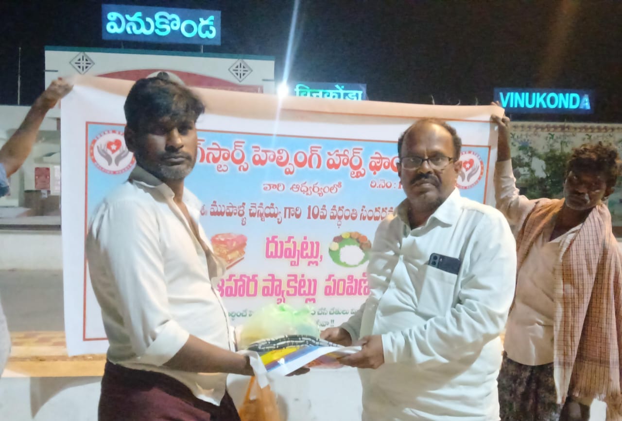 న్యూస్ తెలుగు/వినుకొండ: ప్రముఖ సంఘ సేవకులు, అడ్వకేట్, వినుకొండ ఏజిపి ముప్పాళ్ళ జ్ఞానేశ్వర రావు తండ్రి ముప్పాళ్ళ చెన్నయ్య 10వ వర్ధంతిని పురస్కరించుకుని మానవత్వాన్ని చాటుకున్నారు. ఈ సందర్భంగా యంగ్ స్టార్స్ హెల్పింగ్ హార్ట్స్ ఫౌండేషన్ ఆధ్వర్యంలో వినుకొండ పట్టణంలోని నిరాశ్రయులకు మరియు నిరుపేదలకు భారీ ఎత్తున దుప్పట్లు మరియు భోజనాల పంపిణీ కార్యక్రమాన్ని చేపట్టారు. తన తండ్రి జ్ఞాపకార్థం ప్రతి ఏటా సేవా కార్యక్రమాలు నిర్వహిస్తున్న జ్ఞానేశ్వర రావు, ఈ ఏడాది 10వ వర్ధంతిని పురస్కరించుకుని చలి తీవ్రతను దృష్టిలో ఉంచుకుని, రోడ్డు పక్కన నివసించే అభాగ్యులకు నాణ్యమైన దుప్పట్లను, ఆకలితో వున్నవారికి ఫౌండేషన్ సభ్యులతో కలిసి స్వయంగా భోజనం పంపిణి చేసారు. తన తండ్రి నేర్పిన సేవా దృక్పథమే నన్ను ఈ స్థాయికి చేర్చింది. వారి జ్ఞాపకార్థం నలుగురికి సహాయం చేయడంలో ఉన్న తృప్తి మరెందులోనూ లేదు. యంగ్ స్టార్స్ హెల్పింగ్ హార్ట్స్ ఫౌండేషన్ సభ్యుల సహకారం ఈ కార్యక్రమ విజయానికి ఎంతో తోడ్పడింది అన్నారు. ఈ కార్యక్రమంలో ఫౌండేషన్ అధ్యక్షులు పమిడిపల్లి అనిల్ రాజ్, ఉపాధ్యక్షులు గుమ్మడి మనోహర్, జాయింట్ సెక్రెటరీ పెనుమాల వెంకట్రావు, ట్రెజరర్ కే. సునీల్, తదితరులు పాల్గొన్నారు.(Story : రైతు బాంధవుడు ముప్పాళ్ళ చెన్నయ్య 10వ వర్ధంతి సందర్భంగా నిరాశ్రయులకు దుప్పట్లు, భోజనం అందచేత )