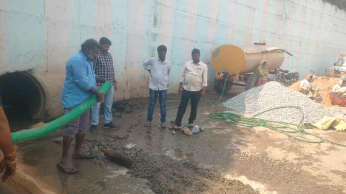 న్యూస్ తెలుగు/వినుకొండ : స్థానిక నూజెండ్ల రైల్వే బ్రిడ్జి కింద వాహనాలు వెళ్లే అండర్ గ్రౌండ్ రోడ్డు అద్వాన్నంగా మారి నీరు నిలిచిపోయి రాకపోకలకు తీవ్ర ఇబ్బంది కలగటంతో మున్సిపల్ అధికారులు రోడ్డు మరమ్మత్తు పనులు చేపట్టారు. బ్రిడ్జి కింద సిమెంట్ రోడ్ అంతా లేచిపోయి గోతులు ఏర్పడి, మురుగు నీరు అంతా నిలిచిపోతుంది. ఇక వర్షం కురిసిన సమయంలో పెద్ద పెద్ద కుంటలుగా మారి వాహనాలు, ప్రజలు రాకపోకలకు తీవ్ర ఇబ్బంది కలుగుతున్న నేపథ్యంలో ఎట్టకేలకు పనులు చేపట్టారు.(Story : స్థానిక నూజెండ్ల రైల్వే బ్రిడ్జి కింద రోడ్డు మరమ్మత్తు పనులు. )