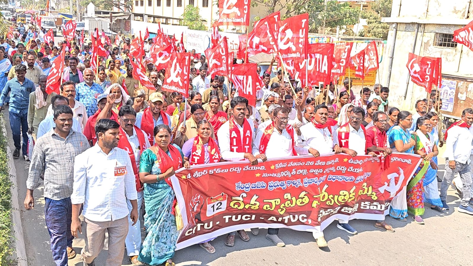 కేంద్రంలో ఉన్న బిజెపి ప్రభుత్వం ప్రజా ఉద్యోగ కార్మిక రైతంగ వ్యతిరేక విధానం నిరసిస్తూ ఈరోజు దేశ వ్యాప్తంగా 30 కోట్ల మంది సమ్మెలో పాల్గొన్నారని తెలియజేశారు. దేశవ్యాప్తంగా సుదీర్ఘకాలంగా కార్మికులు ఆందోళన చేస్తున్న బిజెపి ప్రభుత్వం మొండిగా ధనవంతులకు దండిగా ఆదాయం సమకూర్చే విధానాలలో భాగంగానే నాలుగు లేబర్ కోడ్స్ వచ్చాయని ఎద్దెవ చేశారు. అయినా పెట్టుబడిదారుల ప్రయోజనాలకు కార్పొరేటు శక్తుల లాభాలు చేకూర్చడం కోసం నరేంద్ర మోడీ ప్రభుత్వం పెద్దపీట వేస్తున్నది. కార్మిక వర్గంపై రైతాంగంపై గ్రామీణ వ్యవసాయ కార్మికులపై భారాలు వేస్తున్నది .పోరాడి సాధించుకున్న 29 కార్మిక చట్టాలను రద్దుచేసి నాలుగు లేబర్ కోడ్ లుగా తీసుకోవచ్చింది దేశానికి స్వాతంత్రం రాకముందే బ్రిటిష్ వారితో కొట్లాడి సాధించుకున్న చట్టాలపై బీజేపీ ప్రభుత్వం దాడి చేస్తున్నది చట్టాలను నిర్వీర్యం చేసి కార్మికులను ఆధునిక బానిసలుగా మార్చేందుకు ఈ లేబర్ కోడ్ లు తీసుకువచ్చింది 8 గంటల పని దినాన్ని 12 గంటల పని దినంగా మార్చాలని చూస్తుంది వేతనాలు నిర్ణయించే పద్ధతిని చర్చల ద్వారా కాకుండా ఏకపక్షంగా నిర్ణయించే పద్ధతిని తీసుకువచ్చింది యూనియన్లలో గుర్తించే విషయంలో అనేక మార్పులు తెచ్చింది .ఆయా పరిశ్రమల్లో అడ్వైజరీ బోర్డు తెస్తామని కోడ్ లో పొందుపరిచింది సామాజిక భద్రతపై దాడి చేస్తుంది పిఎఫ్, ఈఎస్ఐ ,గ్రాటివిటీ చట్టాల్లో అనేక మార్పులు చేసి యజమానుల దయ దక్షిణాలపై కార్మికులు ఆధారపడేలా చేస్తుంది .మహిళలను ప్రమాదకరమైన పనులలో రాత్రి వేళల్లో పని మరి చేయించవద్దని గత చట్టాల్లో ఉన్నప్పటికీ నేడు వాటిని రద్దుచేసి పురుషులతో సమానంగా రాత్రింబవళ్లు పనిచేయాలని పద్ధతిని తీసుకువచ్చింది. ప్రభుత్వ రంగ సంస్థలను ప్రైవేటు సంస్థలకు అప్పచెప్పేందుకు తీవ్ర ప్రయత్నం చేస్తున్నది. కోట్ల రూపాయల ప్రజల డబ్బుతో రైల్వే స్టేషన్స్ ఆధునికరించి పెట్టుబడిదారులకు ప్రైవేట్ పరం చేయడానికి పూనుకున్నది. పేద ప్రజల భూములను లాక్కోవడానికి తెచ్చిన మూడు నల్ల చట్టాలను సంవత్సరం పైగా చలికాలం వర్షాకాలం ఎండాకాలం తట్టుకొని నిలబడి రైతులపోరాటం వల్ల ప్రభుత్వం వెనక్కి తీసుకొచ్చినప్పటికీ ఇతర రూపాలలో రైతు వ్యతిరేక విధానాలను కొనసాగిస్తుంది. విత్తన చట్టం 2025 ముసాయిదా విద్యుత్తు సవరణ బిల్లు విబిజి రాంజీ చట్టం ఇతర చట్టాలలో ముందుకు తెచ్చింది. రైతుల పండించిన పంటకు గిట్టుబాటు ధర కావాలని పోరాడితే రాతపూర్వకంగా హామీ ఇచ్చిన నేటికి నెరవేర్చలేని బిజెపి ప్రభుత్వం వ్యవసాయరంగాన్ని సంక్షోభంలోకి నెట్టింది అన్నారు.దీని ఫలితంగా జీవనోపాధి కోసం నగరాలకు వలసలు పెరుగుతున్నాయి నేడు జాతీయ వ్యవసాయం మార్కెట్ ముసాయిదా పత్రం ద్వ